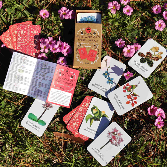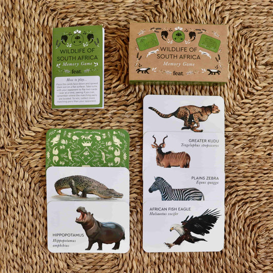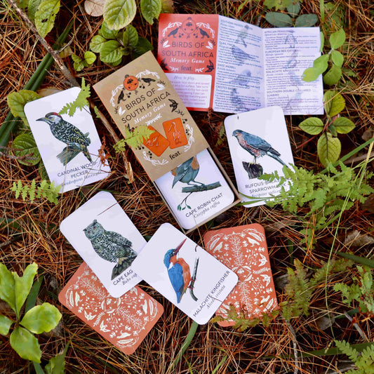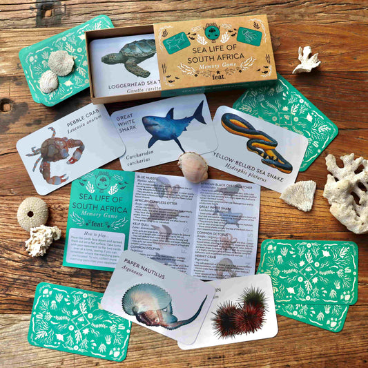 Our South African themed Memory Games feature some of the wondrous wild life, bird life, sea creatures, floral kingdom and insects of our beautiful country. Each game includes 50 cards depicting 25 local creatures with their common and scientific names. It will be your job to get more matching pairs than your opponent, while enjoying all the learning you’ll experience as you admire SA’s incredible biodiversity with each card flip.