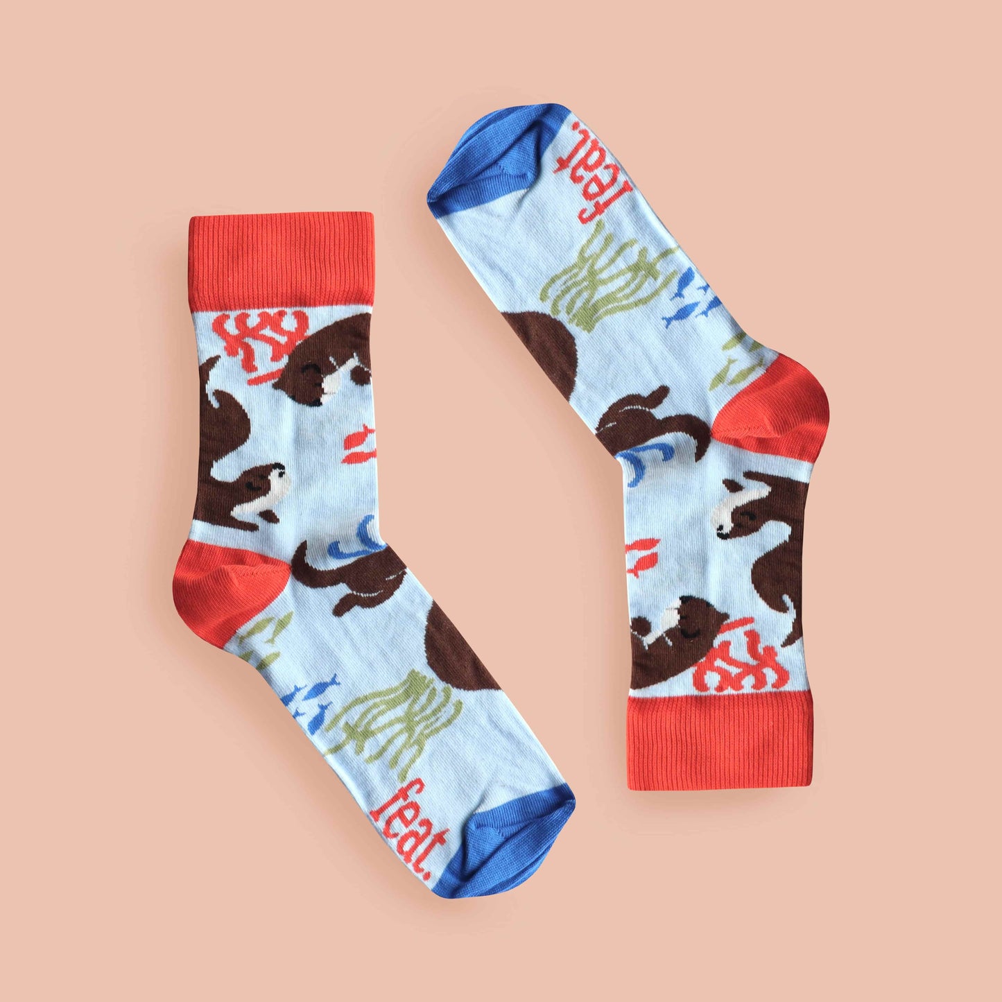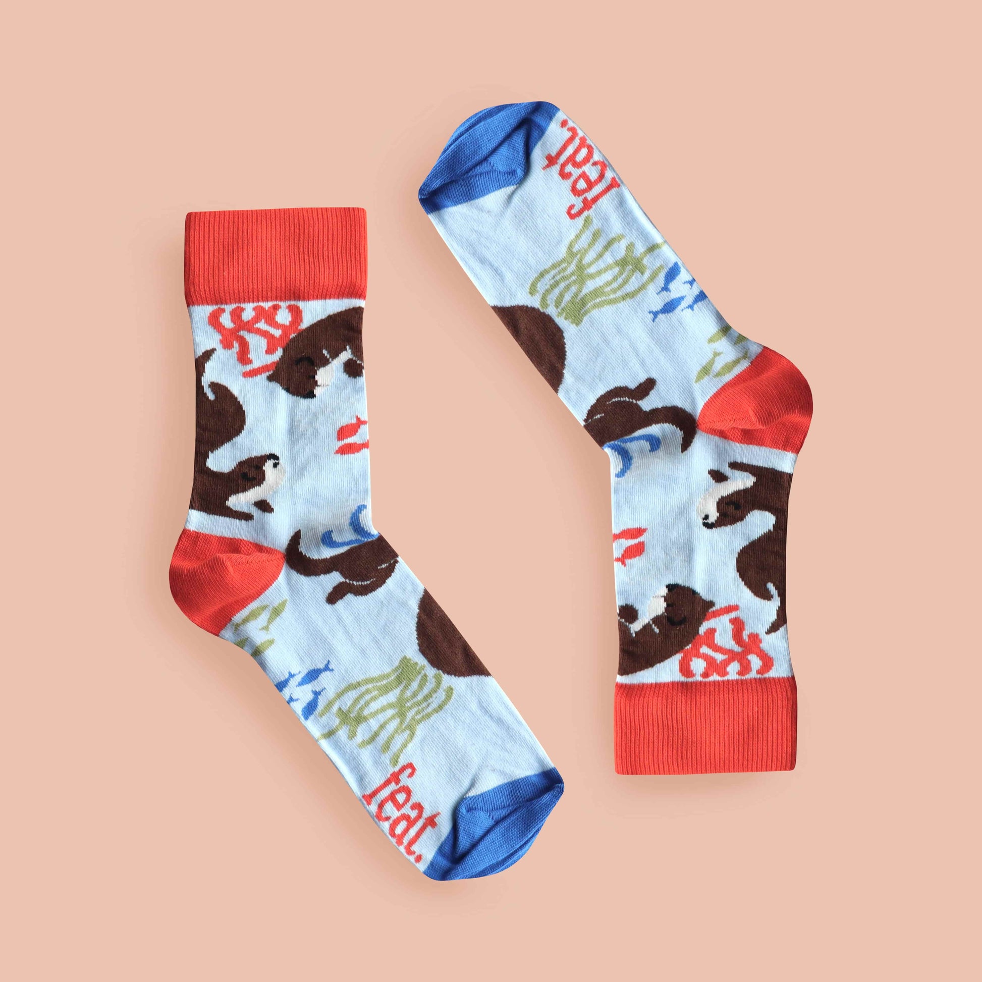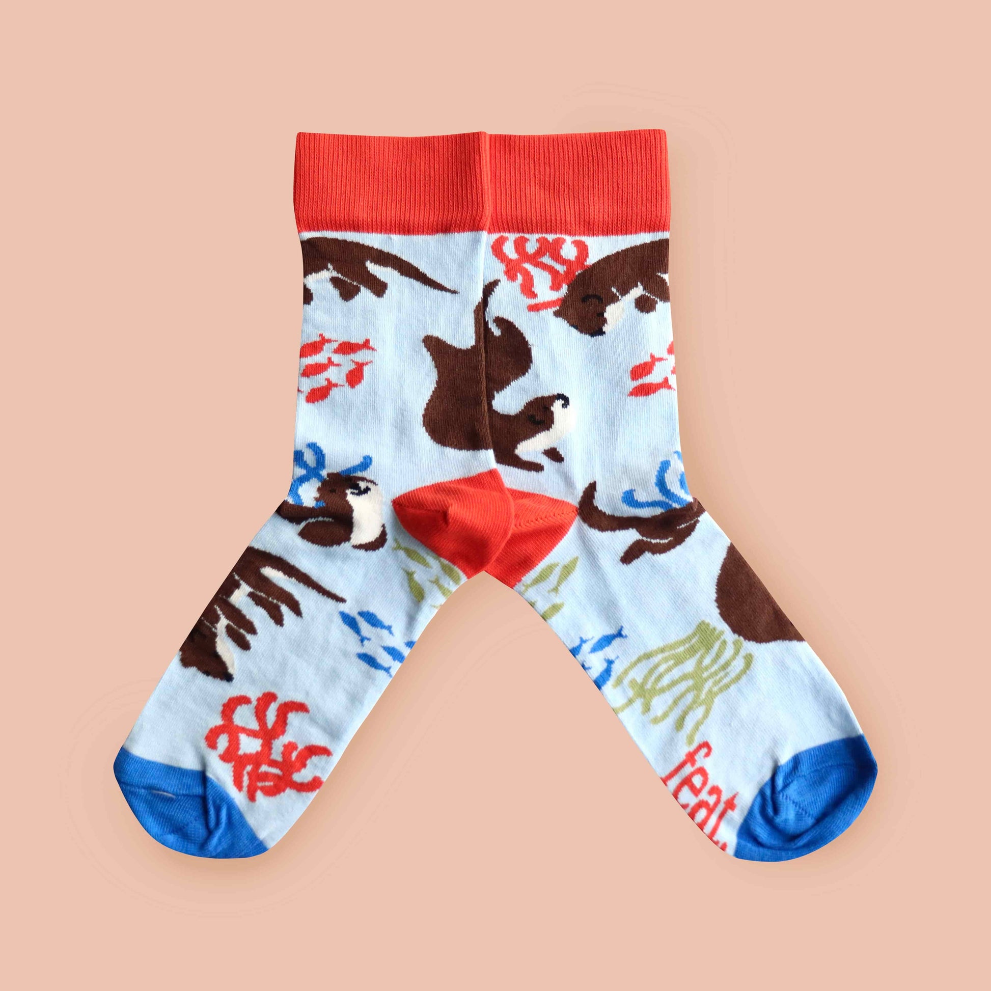 Ladies' blue and orange cotton socks featuring Cape Clawless Otters swimming amongst colourful seaweed.