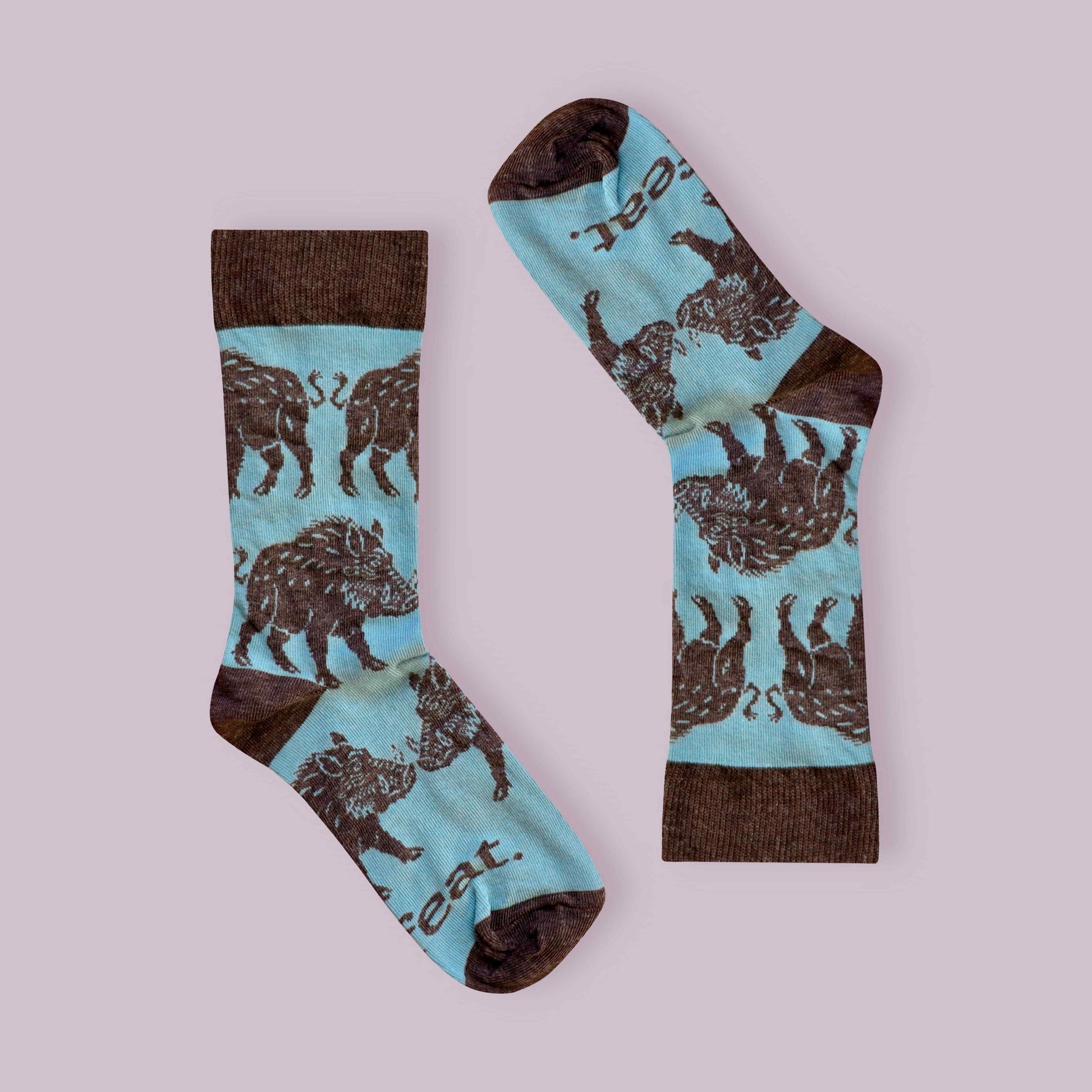 Women’s unique, cotton-rich socks featuring stylized warthog illustrations in mottled brown on a medium blue background. These designer socks were made in Cape Town. View more of our South African Wildlife inspired socks and activities in our Safari wildlife range.