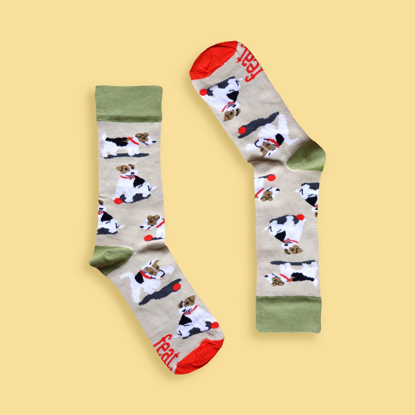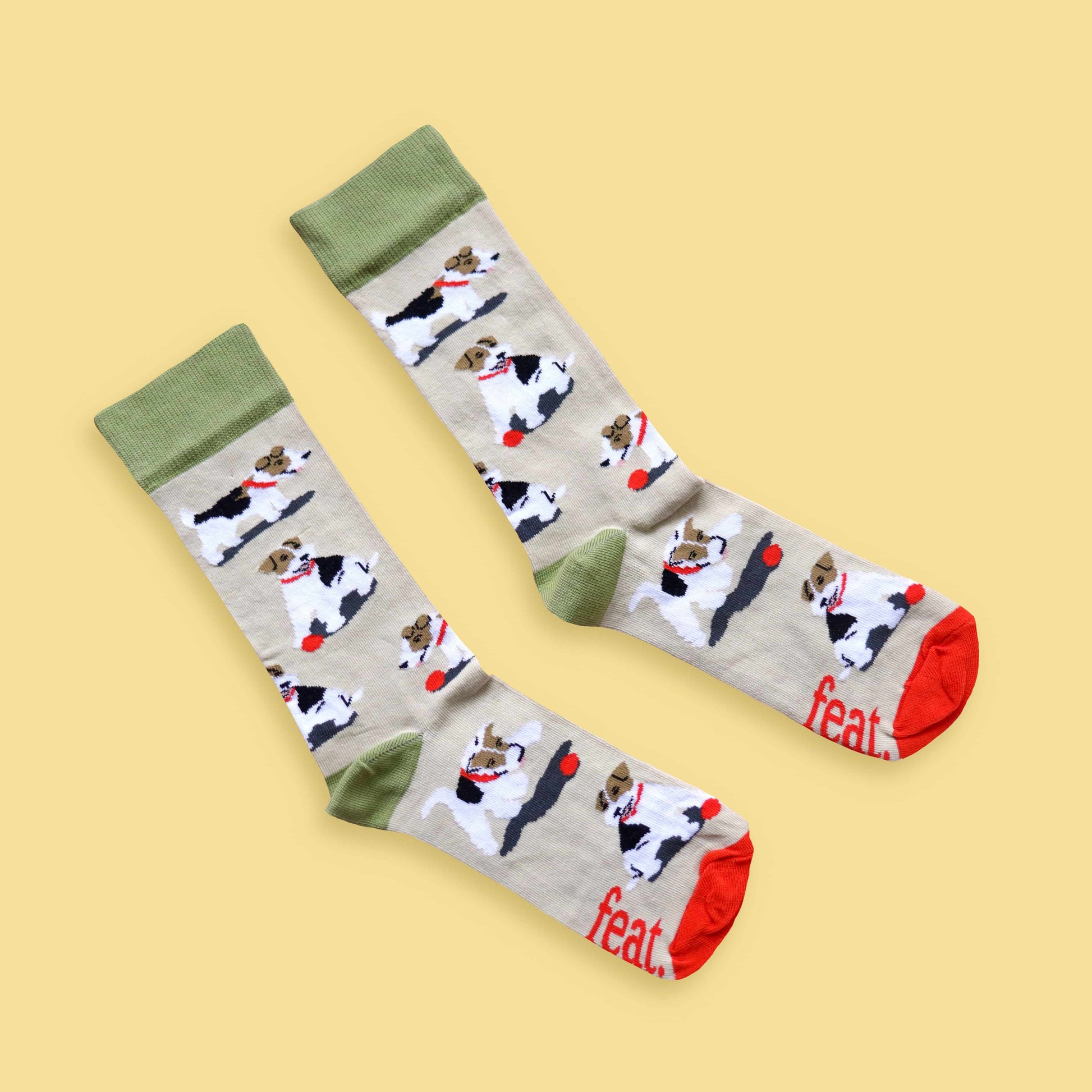 Men’s designer, cotton socks featuring wire haired fox terrier dogs with a ball. This sock design is inspired by our Feat. Designer Goods mascot, Teddie. Take a look at our entire ‘pets’ themed collection here.