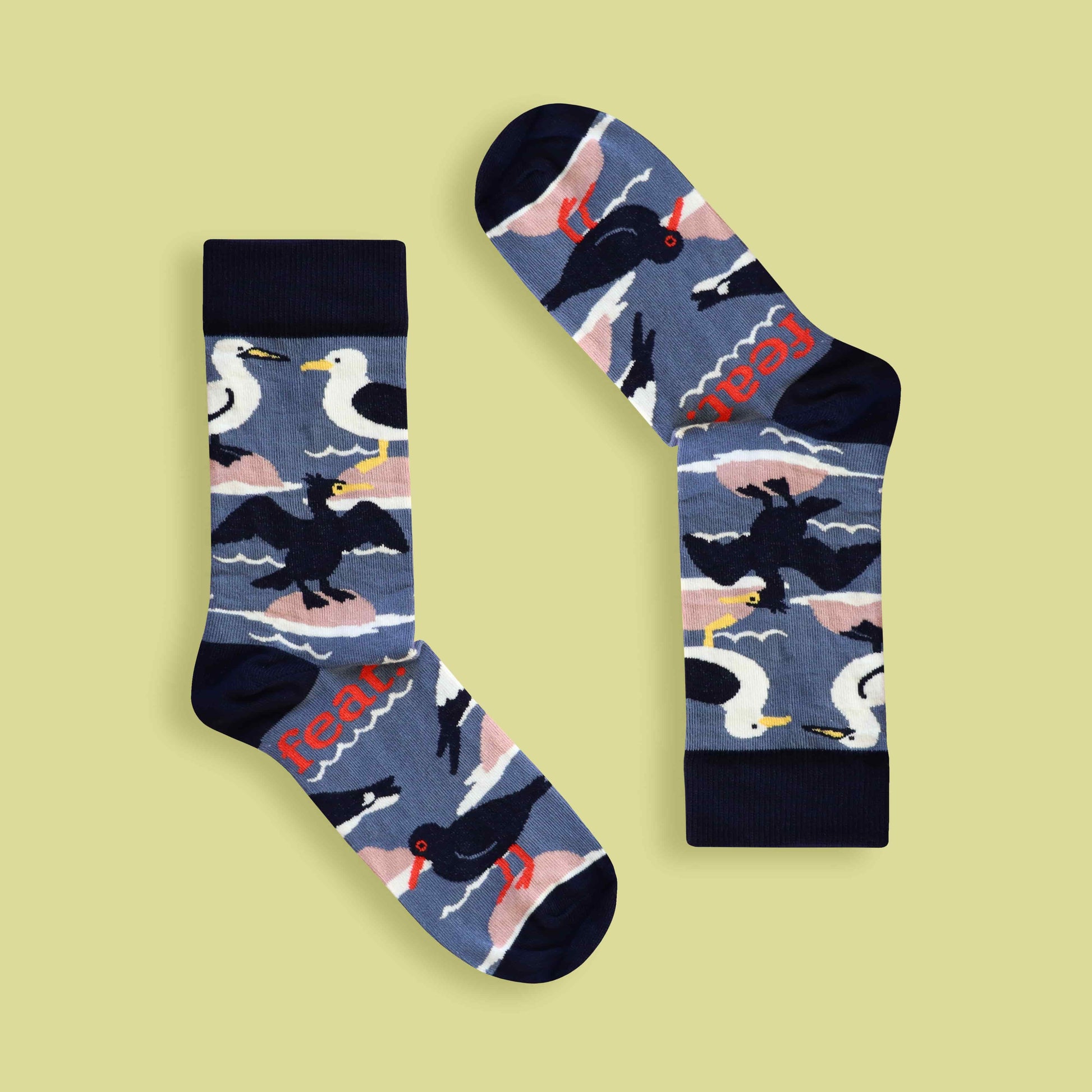 Men’s cotton-rich, designer socks in navy blue and mauve featuring seabirds found on the South African coastline: Cormorants, Cape Gulls, Cape Gannets and Oyster Catchers. Feel free to also a look at our South African sea life collection and our bird-inspired range of designer products.