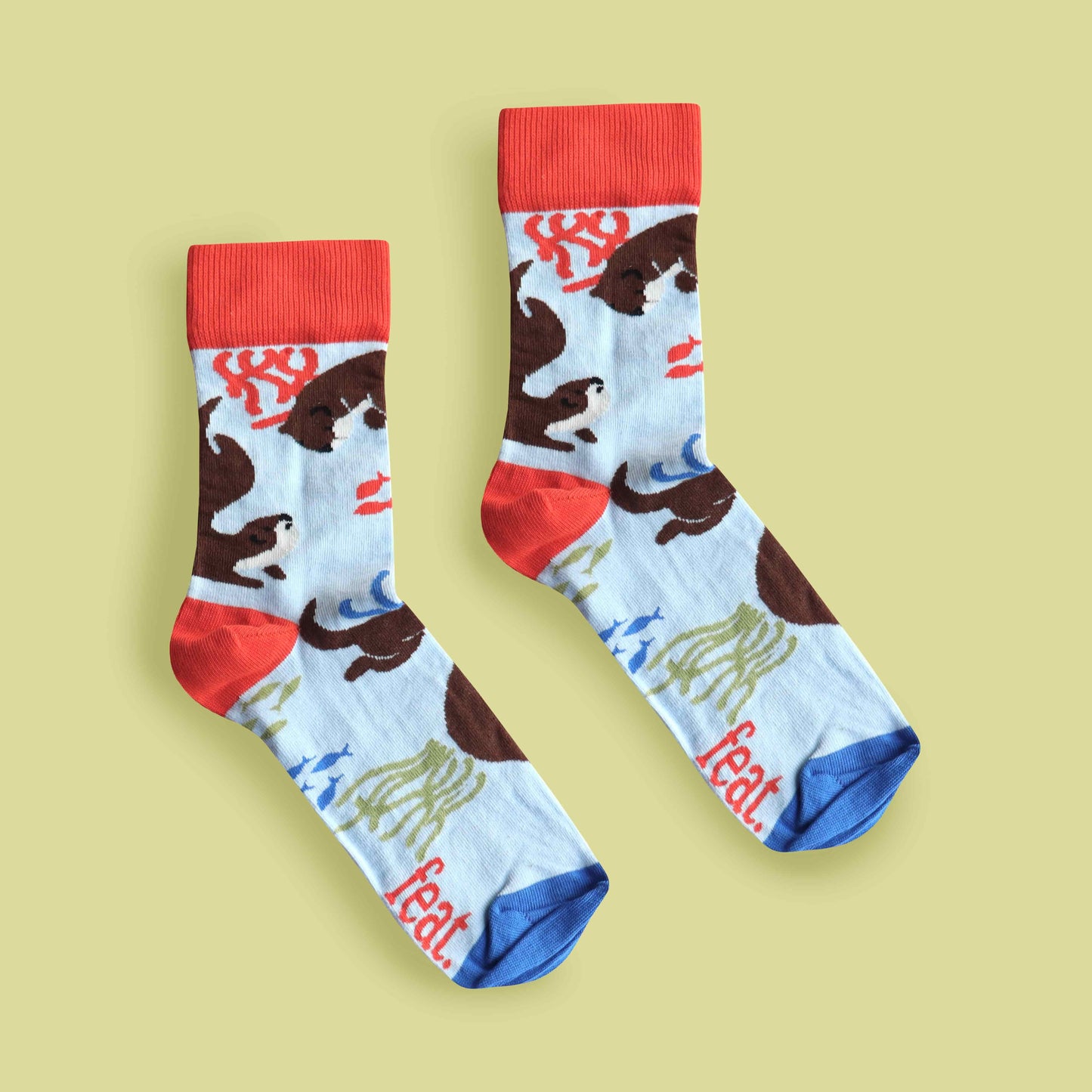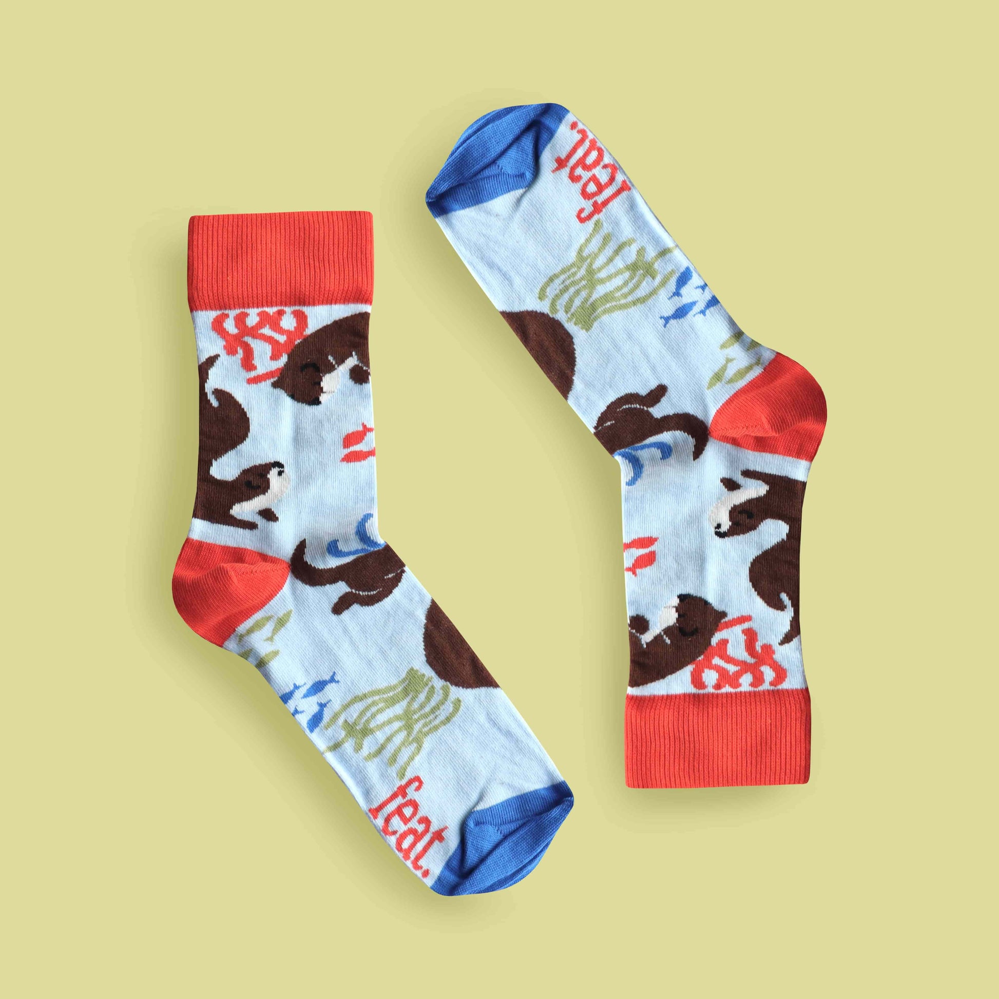 Men's blue and orange cotton socks featuring Cape Clawless Otters swimming amongst colourful seaweed.